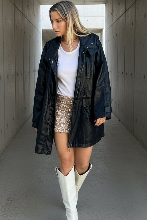 A perfect balance of cozy and glam the soft oversized knit pairs effortlessly with the shimmering sequin mini skirt.