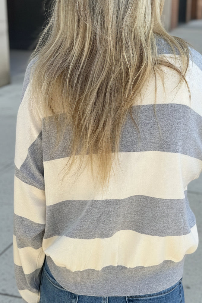 סריג פסים רחבים בסגנון צרפתי קלאסי, יחד עם כיתוב PARIS בטקסטורת רקמה פרוותית — שילוב מנצח של רומנטיקה וסטייטמנט.