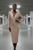 הכיווץ המרכזי בחזית מדגיש את המותן והחזה, בשילוב שרוולים ארוכים וגזרה נקייה – מושלם לאירועי ערב, חתונות וחגיגות.