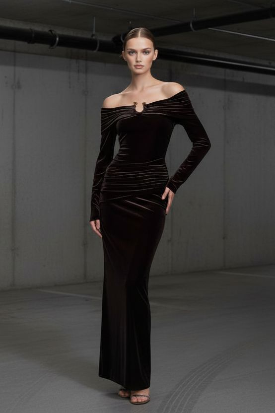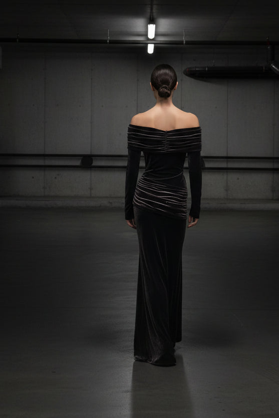 שמלת ערב מקסי אוף־שולדר מבד קטיפה שחור