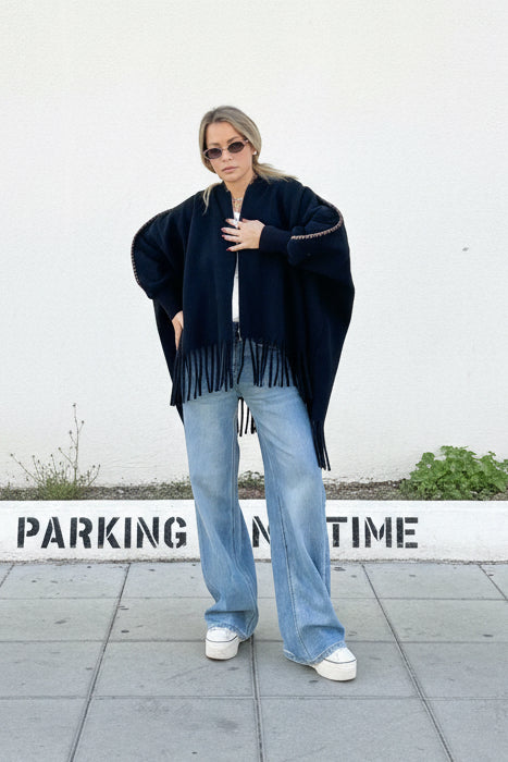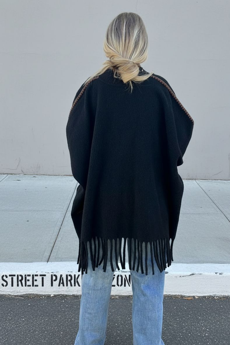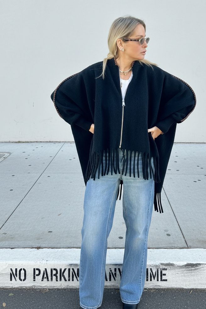 ג׳קט־פונצ׳ו רך ומפנק בגזרה אוברסייז, עם סגירת רוכסן קדמית ושוליים מעוטרים בפרנזים לסטייטמנט שיקי ולא מתאמץ.