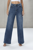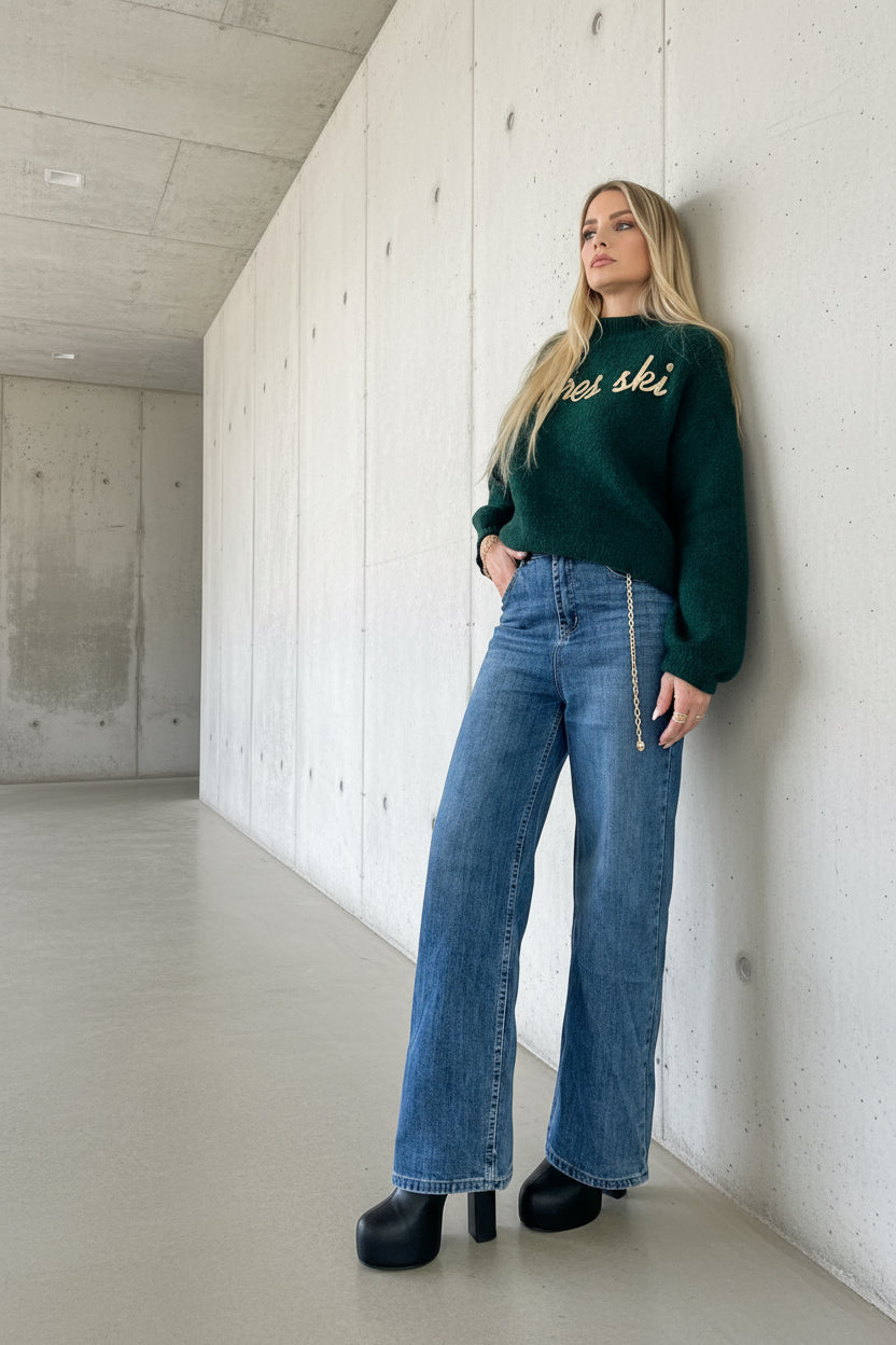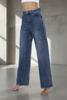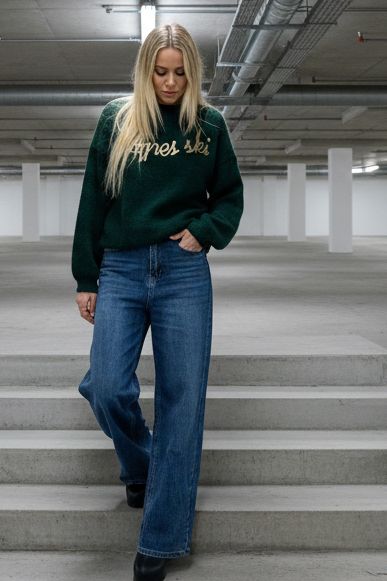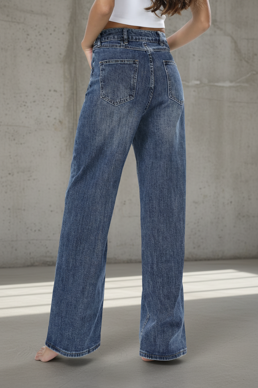 ג’ינס בגזרת מותן גבוהה עם רגל ישרה-רחבה, יוצר מראה מחמיא, ארוך ומדויק.