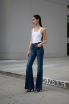 הג’ינס יושב גבוה על המותן, אוסף ומדגיש את קו המותניים והירכיים, ונפתח בעדינות מהברך למראה ארוך, נשי ומאוד מחטב.