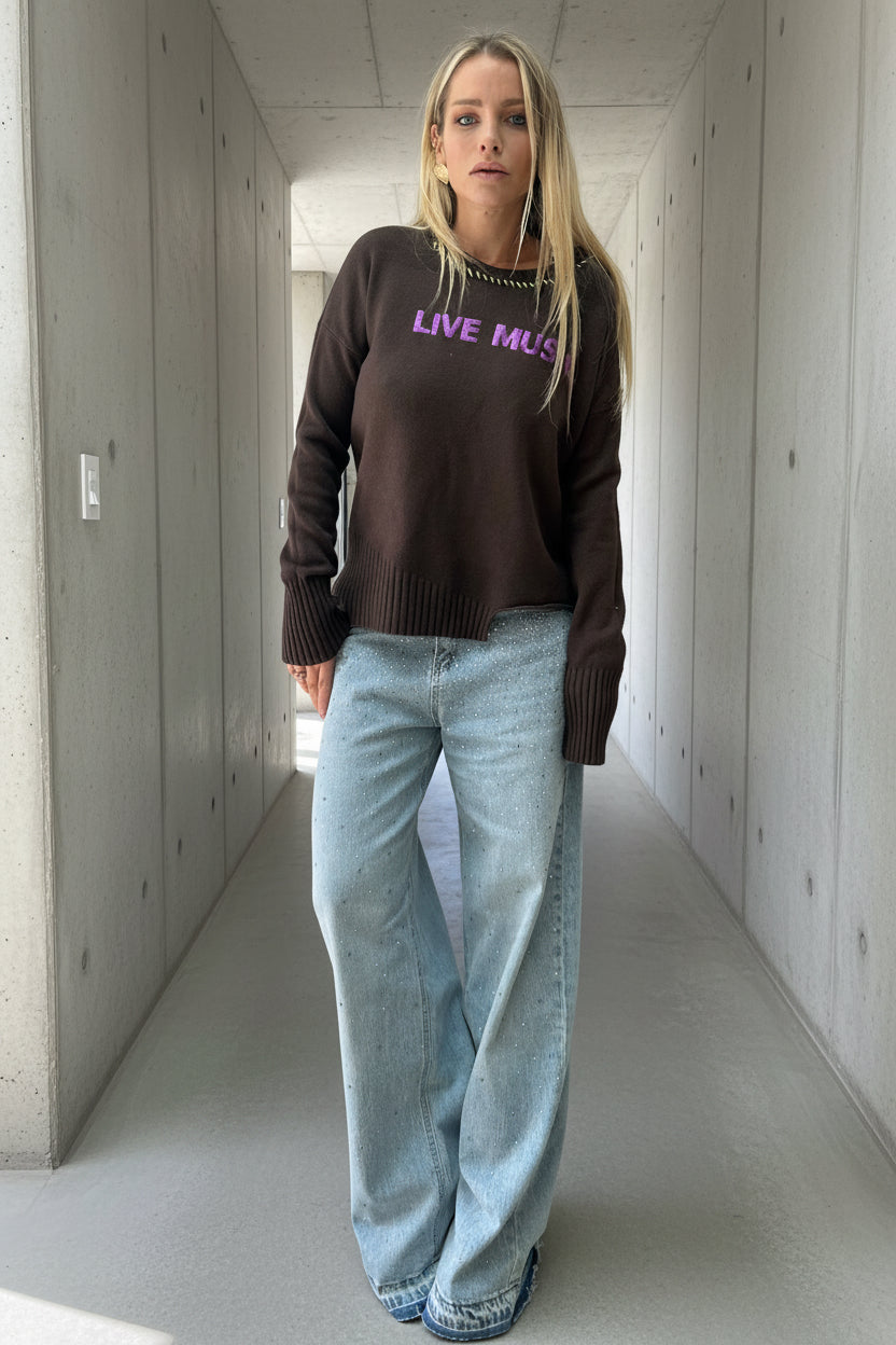 ג׳ינס בגזרה ישרה-רחבה עם יהלומים קטנים על כל הגינס -הטרנד המוביל של העונה.
