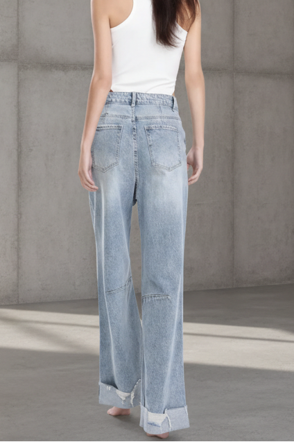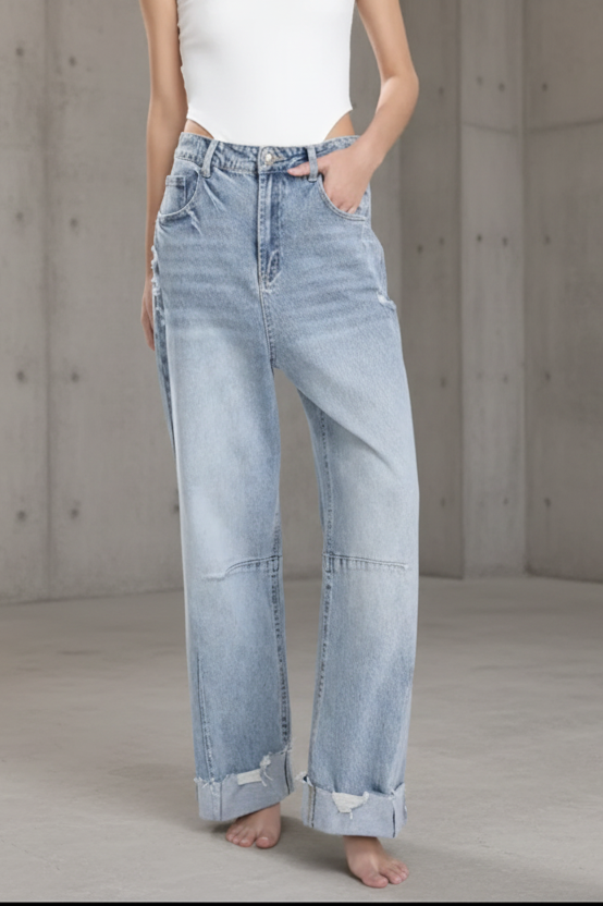 גימור ווש בהיר עם אפקט שחיקה טבעי, וקיפול מכפלת טרנדי שמוסיף אופי וסטייל.