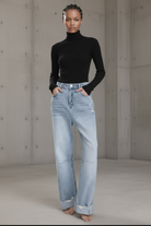 ג’ינס בגזרת מותן גבוהה עם רגל רחבה ונשפכת, מחמיא לגוף ויוצר מראה ארוך ונינוח.