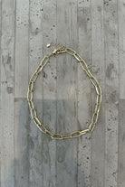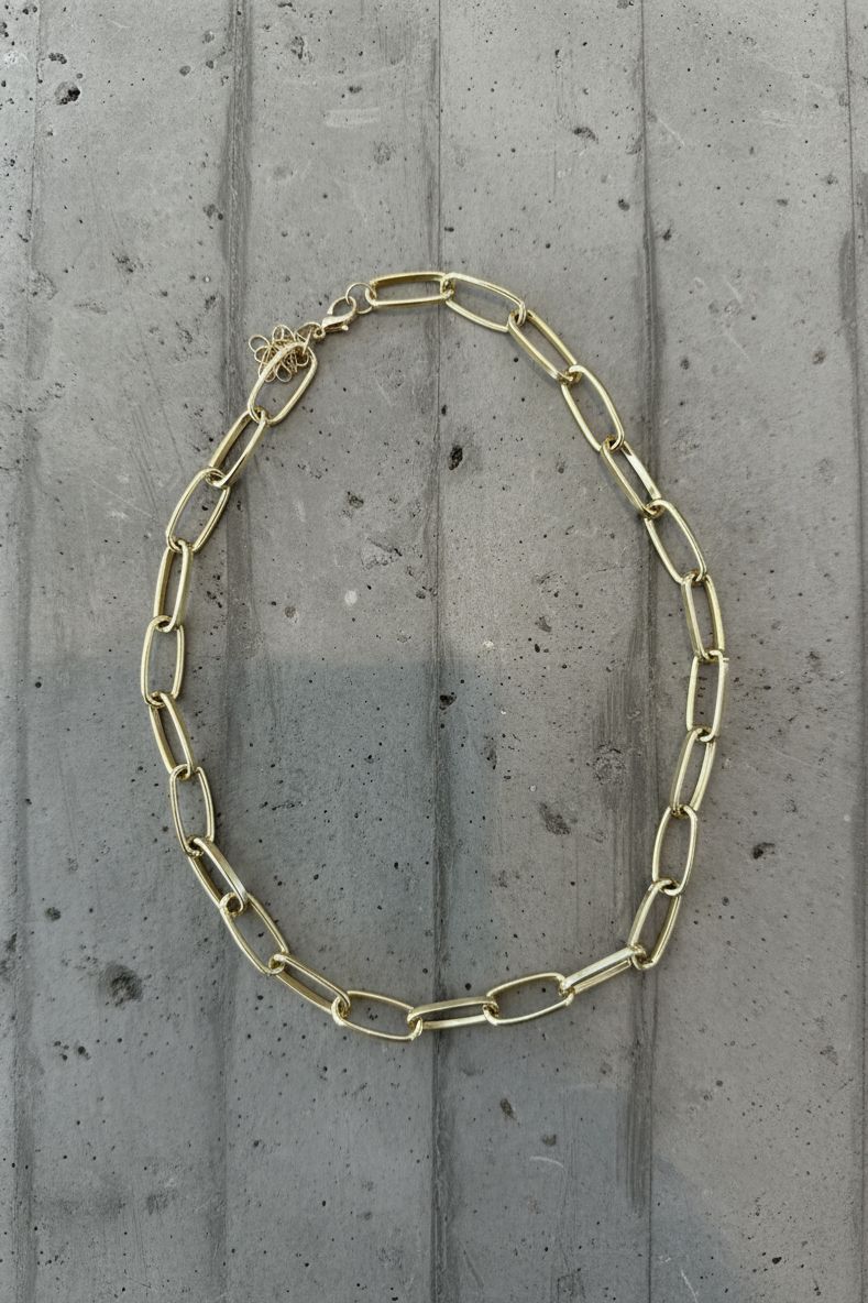 שרשרת חוליות מוזהבת בגזרה נקייה ומדויקת, עשויה חוליות אובליות גדולות במראה מודרני ואלגנטי.