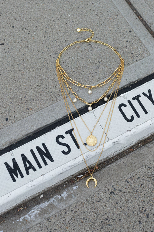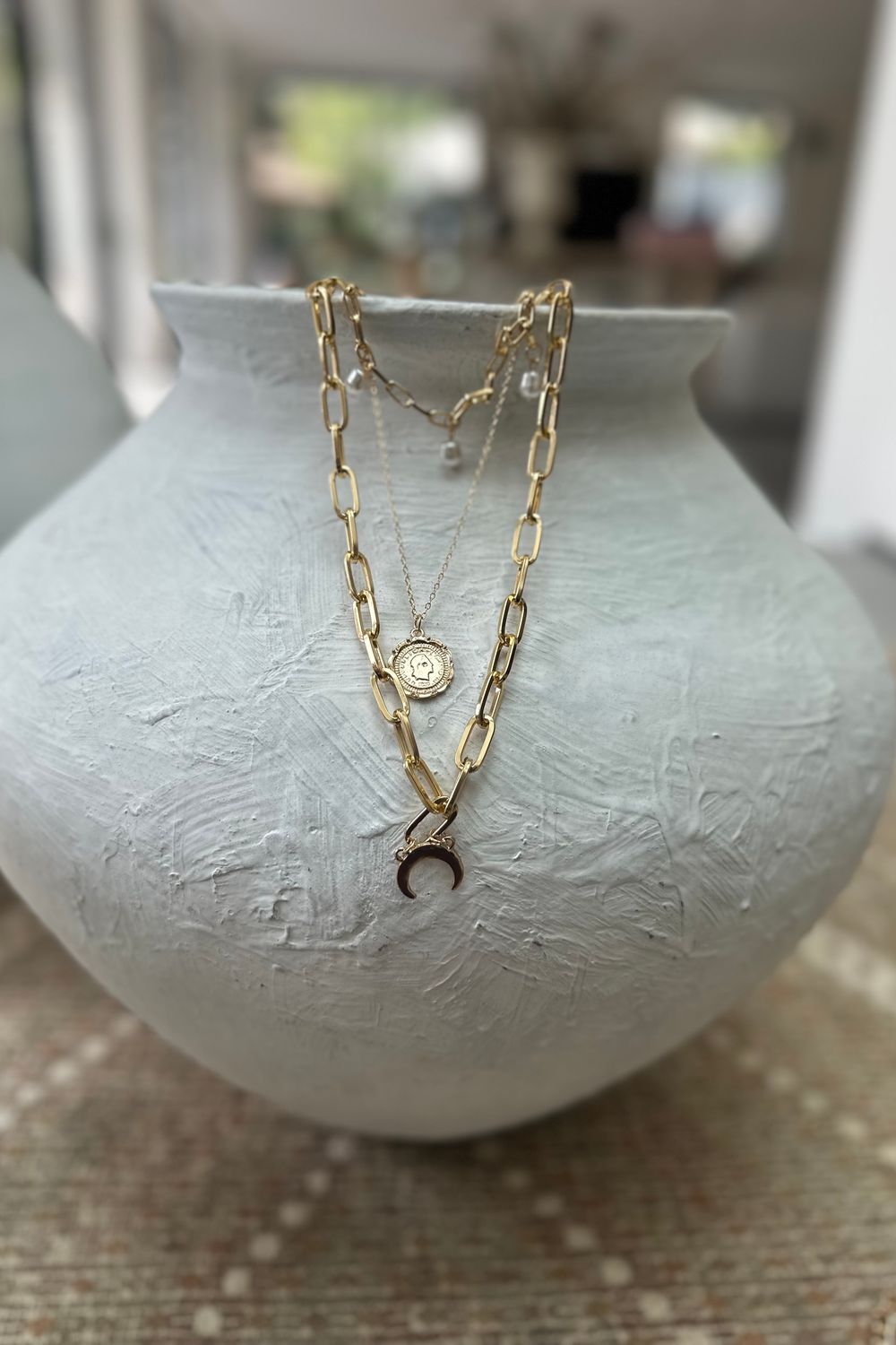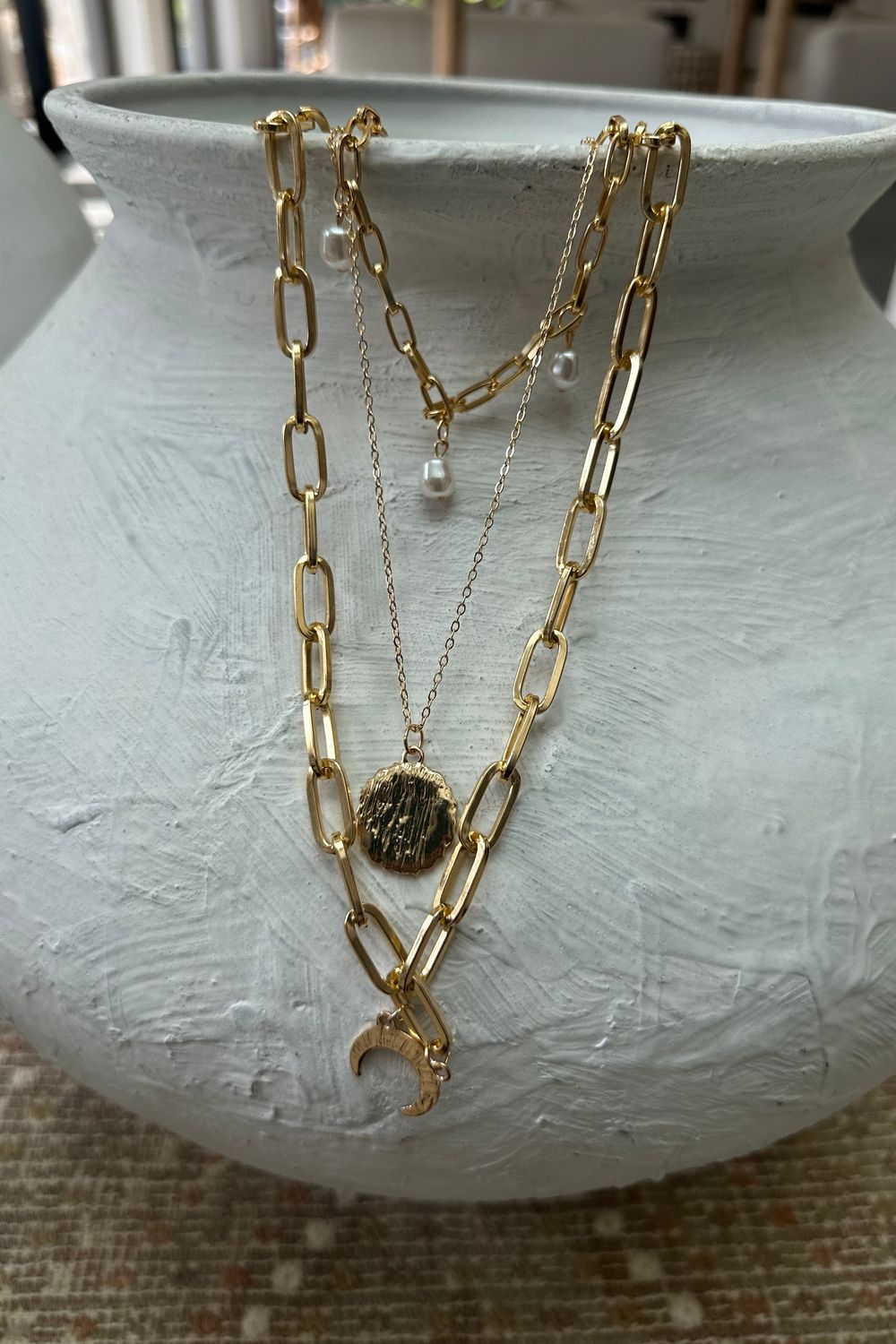 שרשרת חוליות עבות, שרשרת עדינה עם תליון מטבע רומאי, ושרשרת קצרה עם פנינים קטנות לתוספת רכות וקלאס.