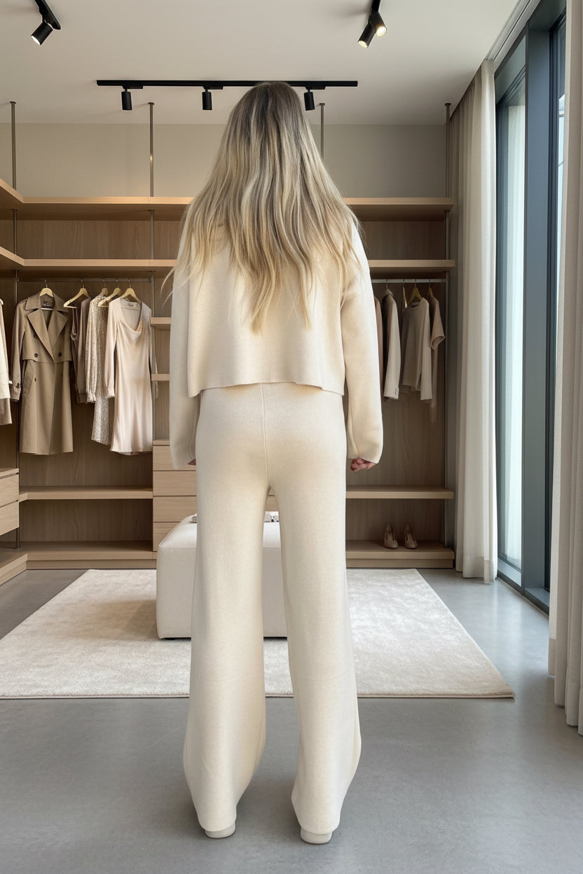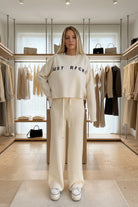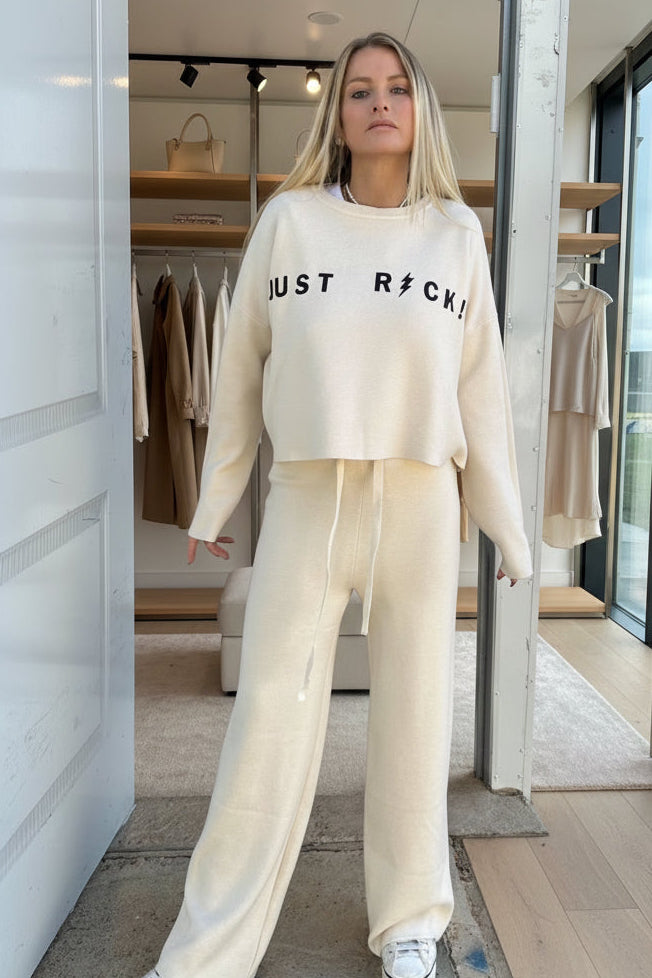 סט סריג רך ונעים הכולל סווטשירט קרופ בגזרה נינוחה עם הדפס קדמי, ומכנס תואם בגזרה ישרה עם גומי ושרוך במותן.