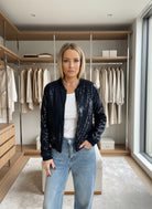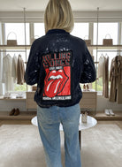 ג’קט בומבר שחור בעיטור פייטים מנצנץ, עם הדפס אייקוני של Rolling Stones בגב – לוק רוקנרול קלאסי עם טוויסט זוהר.