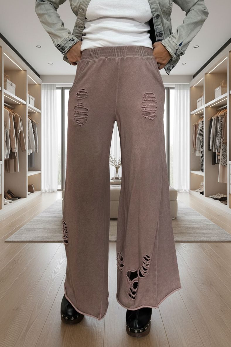 מכנס טרנינג ייחודי עם קרעים מעוצבים בלוק וינטג’ בוהו־אורבני מדויק.