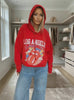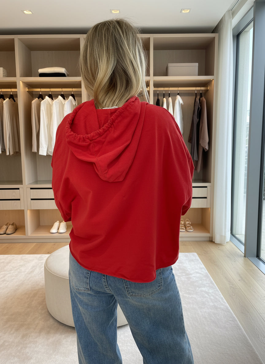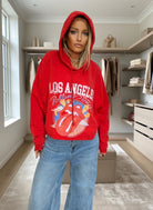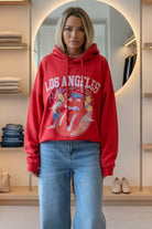 סווטשירט קפוצ’ון אדום בגזרת אוברסייז עם הדפס אייקוני בסגנון לוס אנג’לס רוק-סטייל. בד רך ונעים, נוח ליום-יום ולסטייטמנט חזק בערב.