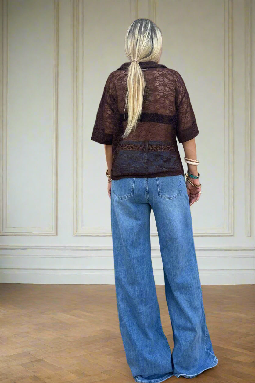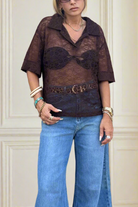 חולצת תחרה חומה עם צווארון  ושרוולים קצרים