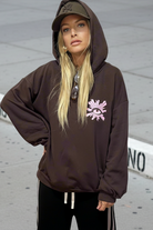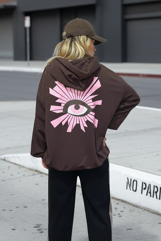 סוויטשרט אוברסייז מבד פליז רך ונעים, בגוון חום עמוק עם הדפס עין בגווני ורוד בייבי מלפנים ומאחור.