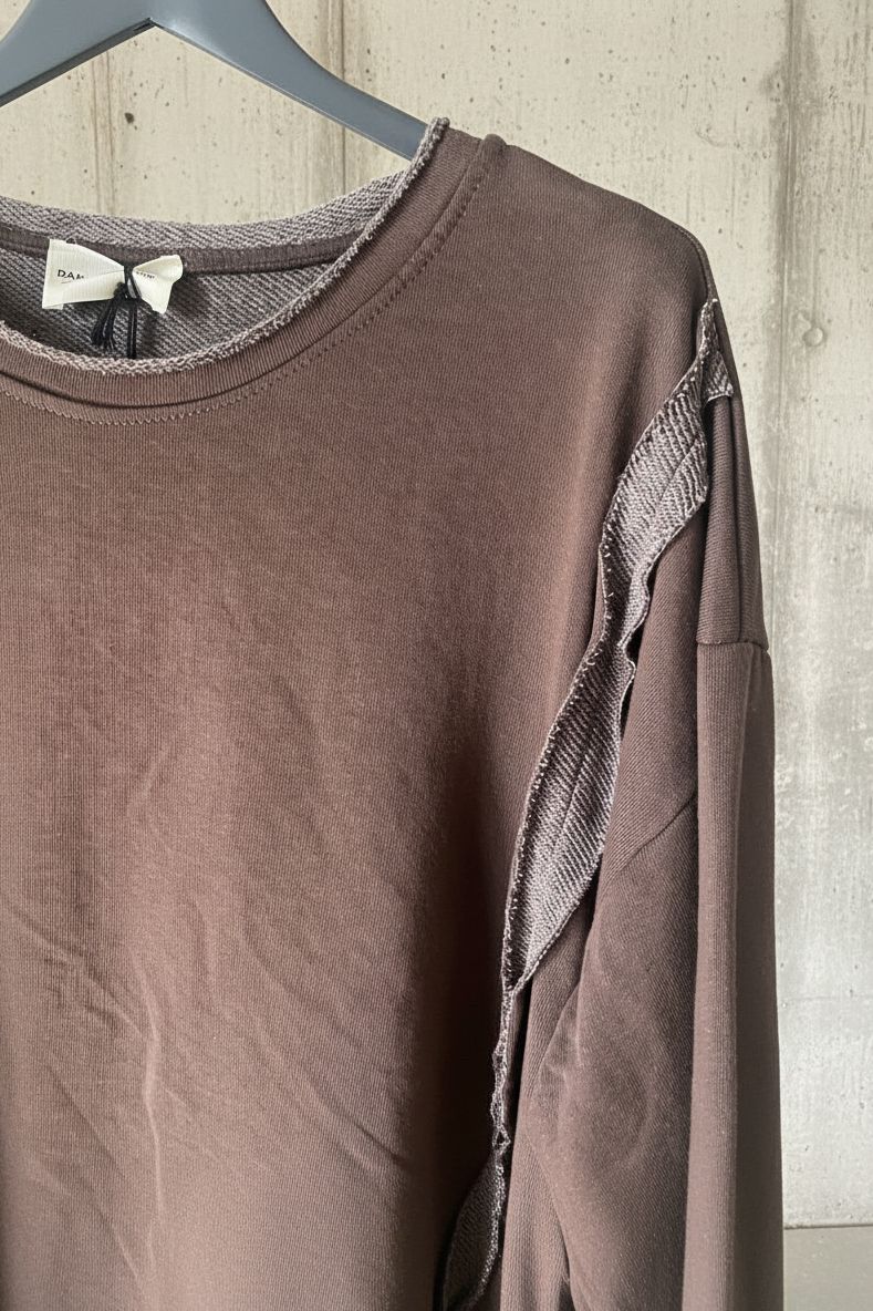 עשוי מבד כותנה רך ונעים, בגזרה מעט אוברסייז עם חיתוכים גולמיים ותפרים חשופים שמעניקים לו מראה מחוספס אך מתוחכם.