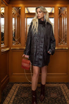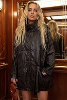 מעיל   עור בצבע חום כהה בגזרה מחמיאה ואלגנטית, בעיצוב על-זמני שמשתלב מושלם עם כל לוק חורפי.