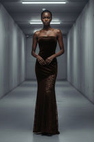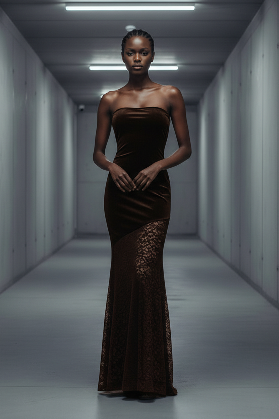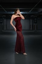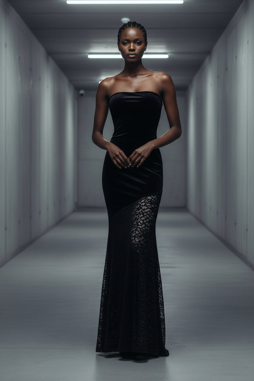 שמלת סטרפלס מבד קטיפה רך בשילוב תחרה עבה ונשפכת בחלקה התחתון.