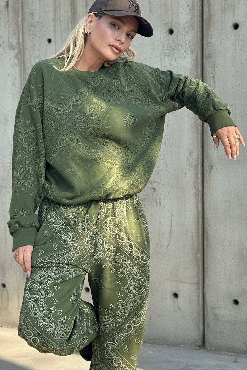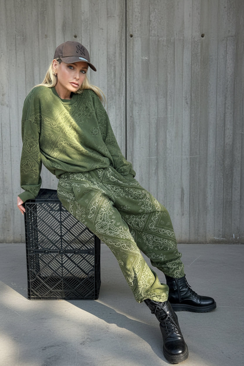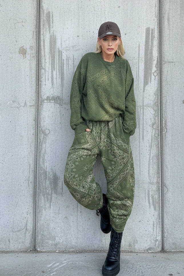 מכנס טרנינג דגם בנדנה גוון בורדו בגזרה משוחררת ונינוחה, עם הדפס בנדנה ייחודי לכל האורך לווייב אורבני ושיקי.