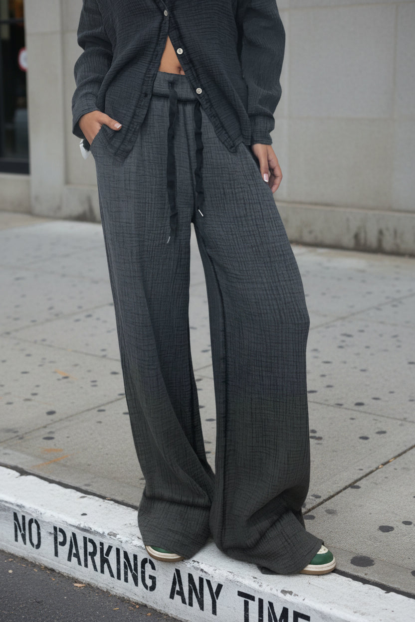 מכנסי כותנה פיקה בגזרת אוברסייז משוחררת, עם גומי אלסטי וגזרת שרוך מתכווננת לקשירה קדמית. עשויים מבד אוורירי, נושם ונעים למגע, מושלמים ליום קיץ או למראה קז’ואל-אלגנטי. מגיעים עם כיסים בצד לנוחות מקסימלית.