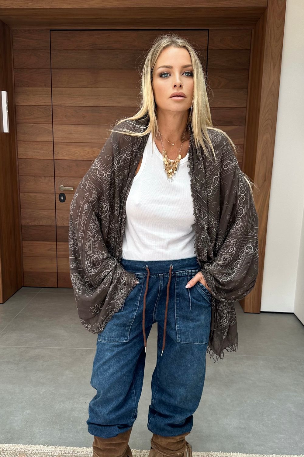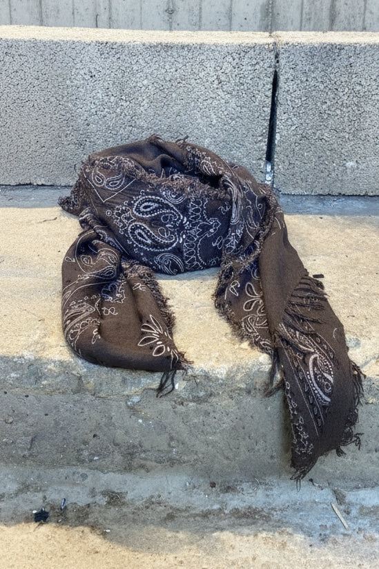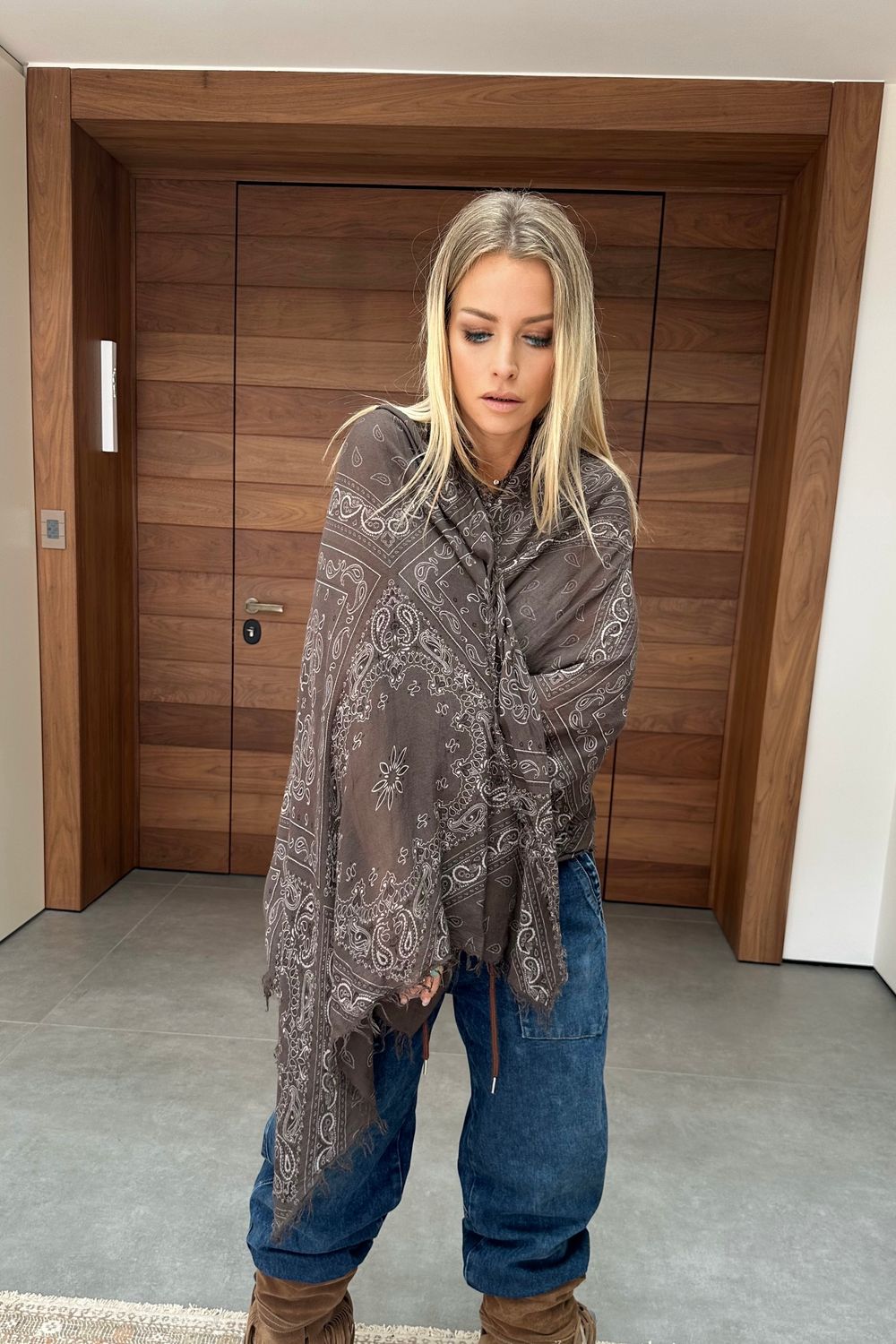צעיף בנדנה גדול ורך, במרקם קליל ומאוורר, עם הדפס בנדנה קלאסי שמשדר וייב בוהו־שיק מושלם.