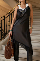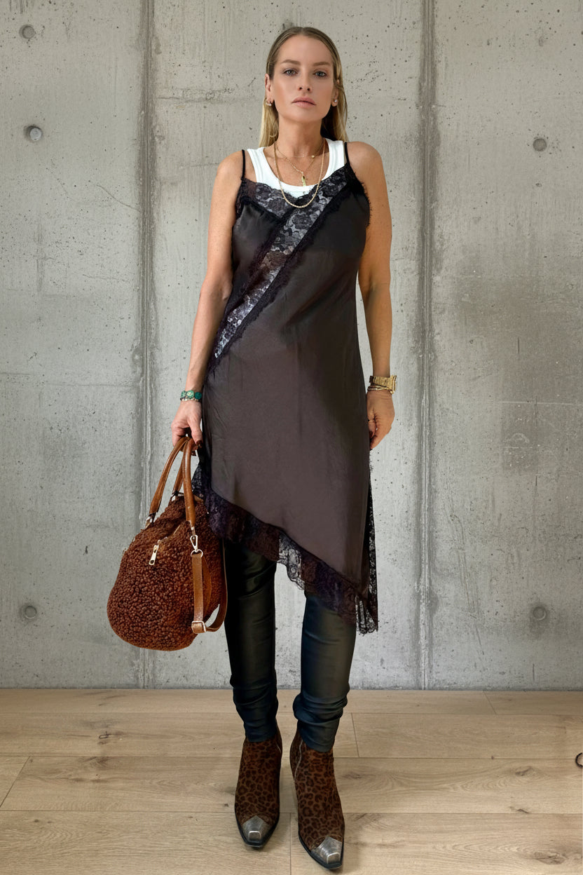 שמלת עשויה מבד סילקי רך עם מגע מלטף ונפילה טבעית, מעוטרת בתחרה עדינה במחשוף ובשוליים בגזרה אלכסונית שמעניקה לה מראה מתוחכם ומחמיא.