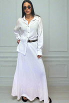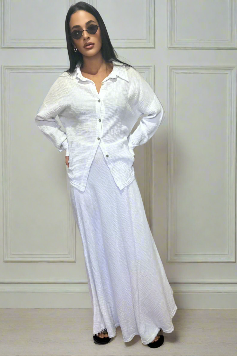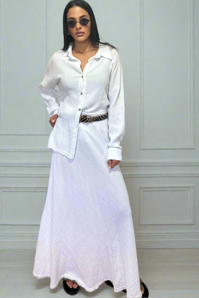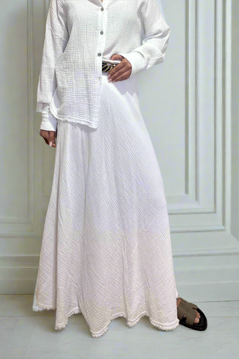 חצאית מקסי לבנה מבד כותנה פיקה קליל ונושם, בגזרה מתרחבת ונשפכת עם גימור פרום בשוליים. החגורה עשויה גומי נוח, מה שהופך אותה מתאימה גם למידות עד 40. מושלמת ליום-יום וגם לערב, מעניקה מראה טבעי, נשי ומלא סטייל
