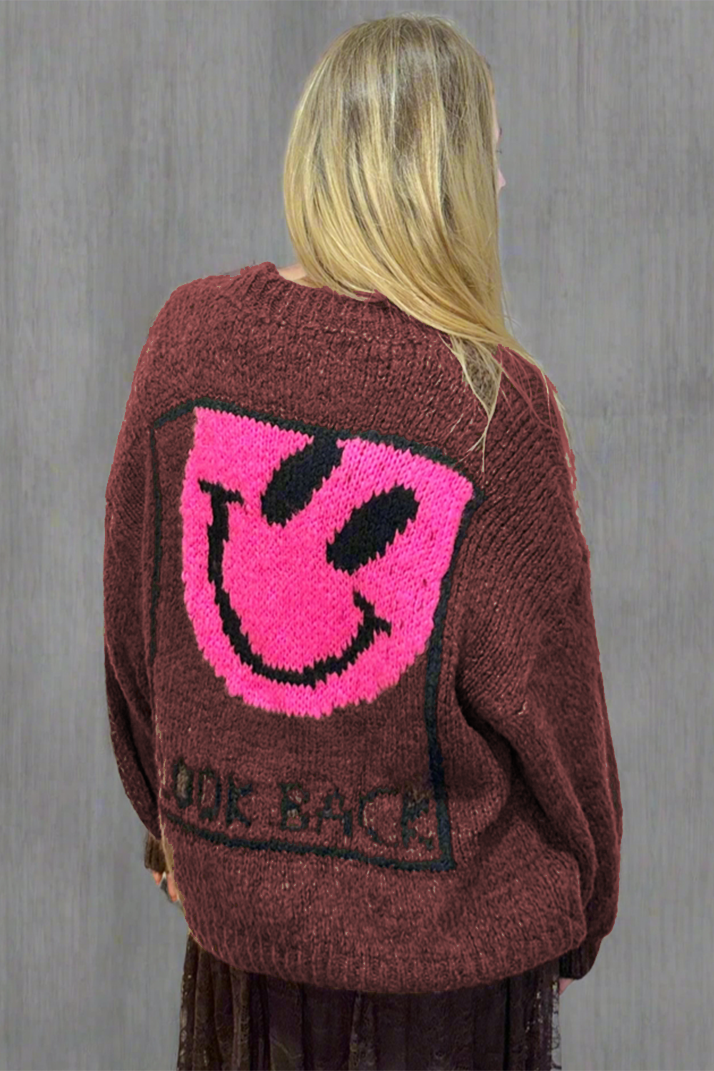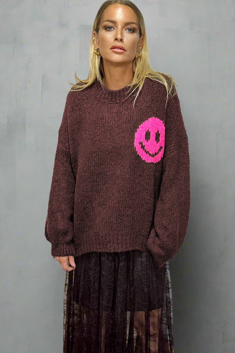 סריג אוברסייז רך ומחמם בגוון חום קפה, עם הדפס סמיילי גדול בצבע ורוד פלור המסמל שמחה ואנרגיה חיובית.