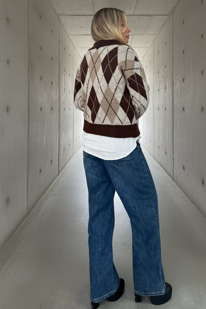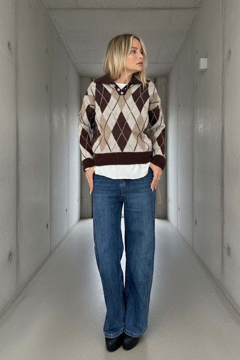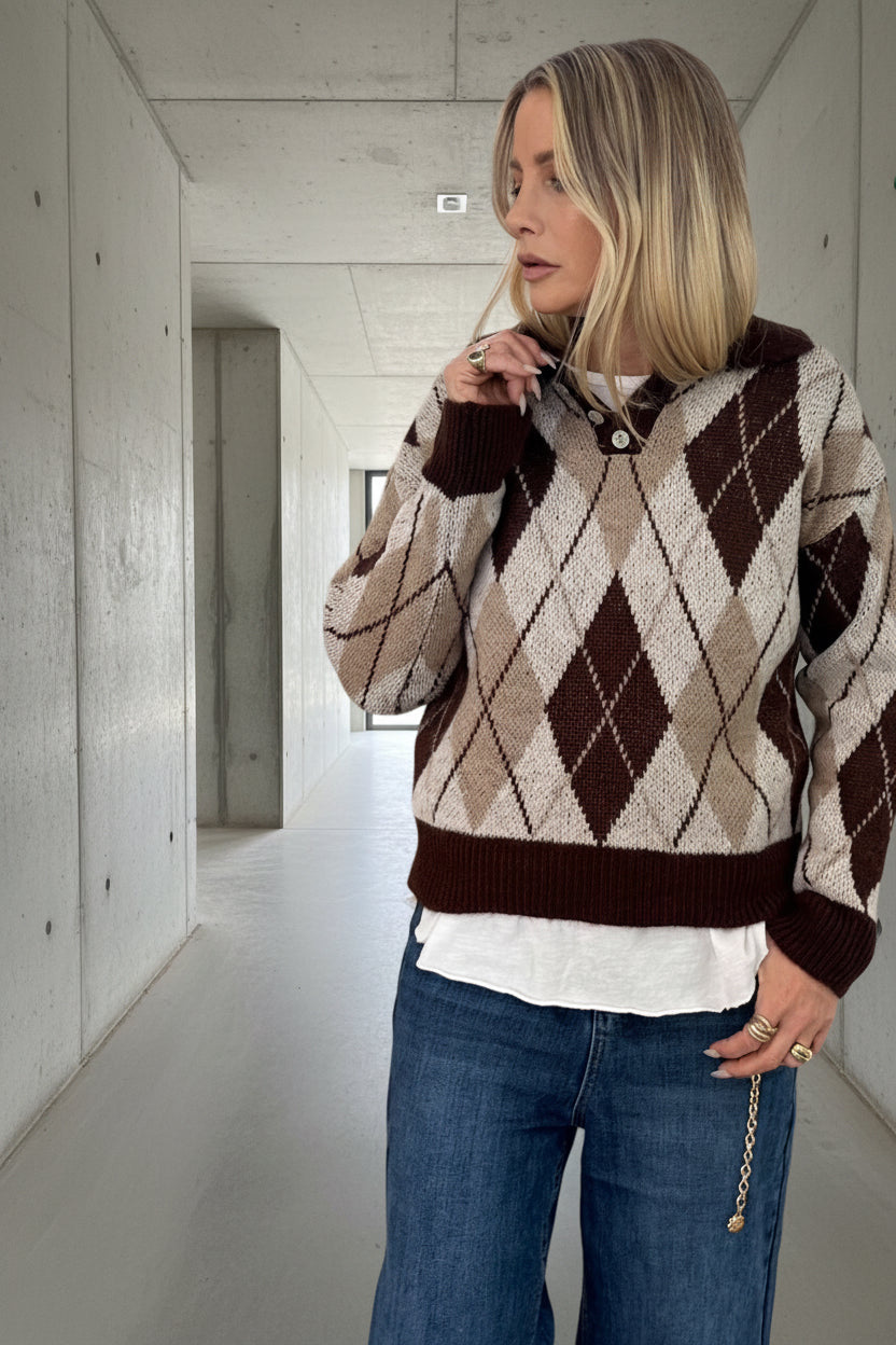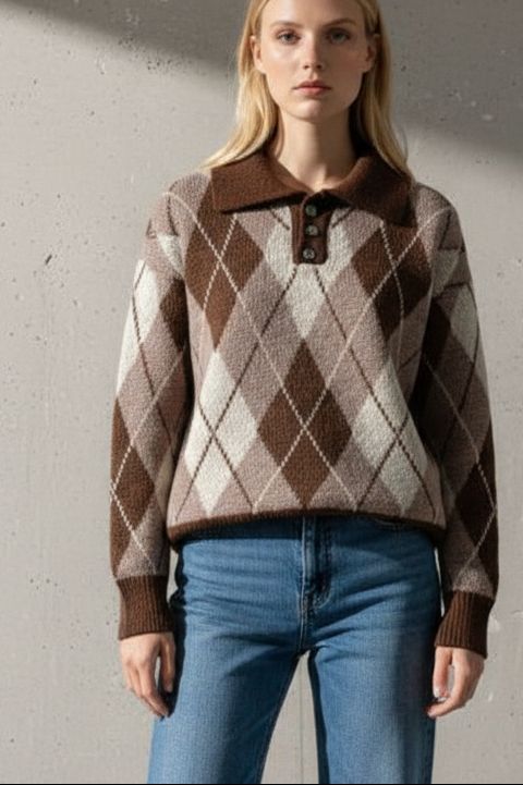 סריג רך ונעים בגזרת וואן סייז מחמיאה, עם הדפס ארגייל קלאסי בגוונים חמים של חום, בז’ ושמנת.