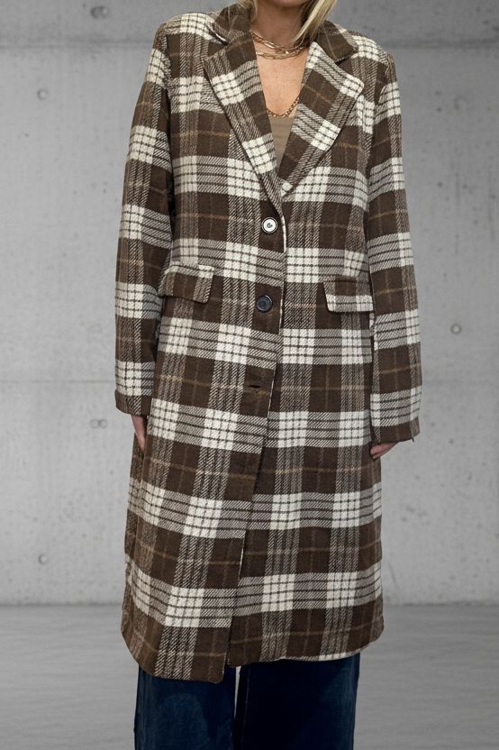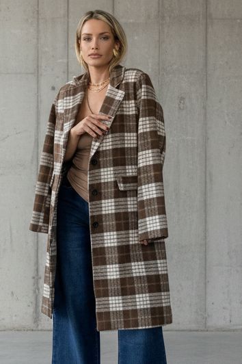 מעיל משובץ בעל מראה קלאסי ועל-זמני, בגזרה ישרה ומעט אוברסייז שמחמיאה לכל מבנה גוף. עשוי בד נעים וחמים במראה חורפי מושלם, עם דוגמת קוביות בגווני חום–שמנת שנותנת טאצ’ של אלגנטיות כפרית.