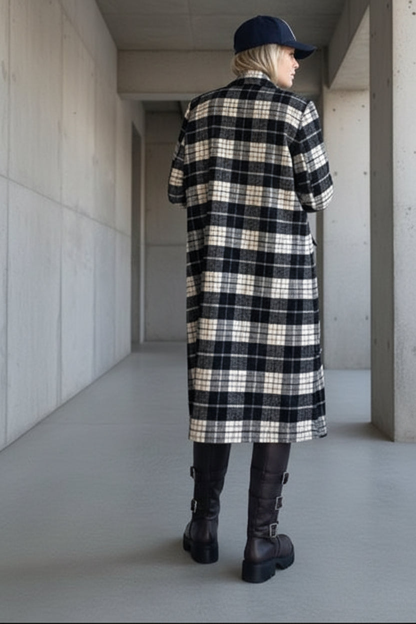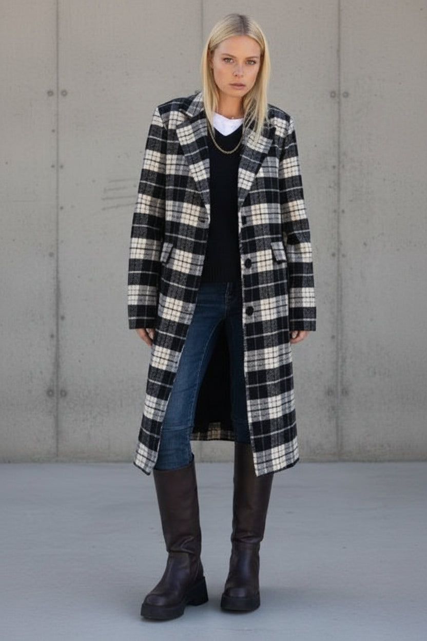 מעיל משובץ בעל מראה קלאסי ועל-זמני, בגזרה ישרה ומעט אוברסייז שמחמיאה לכל מבנה גוף. עשוי בד נעים וחמים במראה חורפי מושלם, עם דוגמת משבצות -שיא הטרנד של העונה.