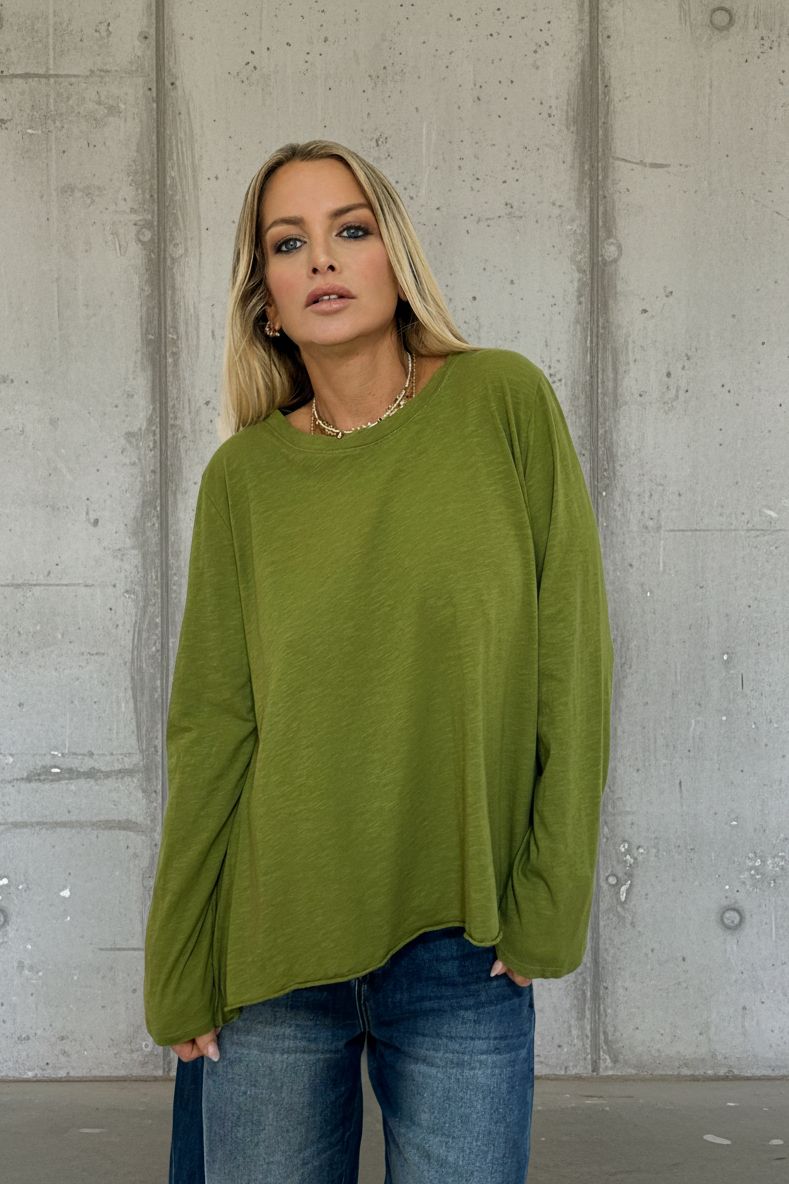 טי שירט ארוכת שרוול בגזרת אוברסייז משוחררת, עשויה מ־100% כותנה רכה ונעימה למגע.