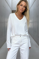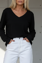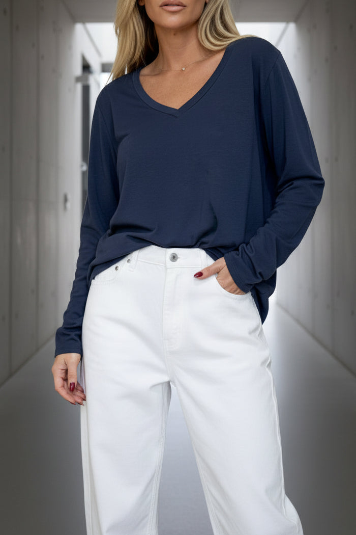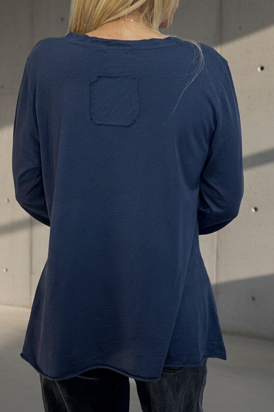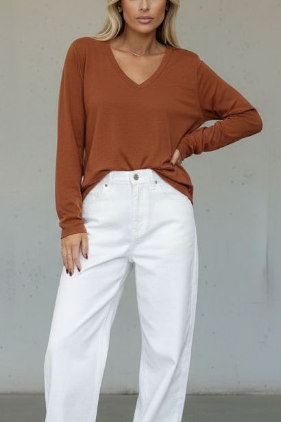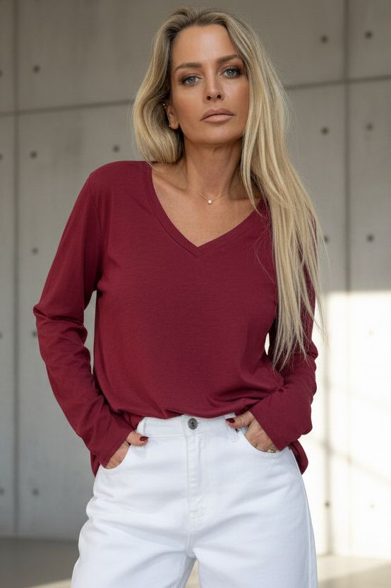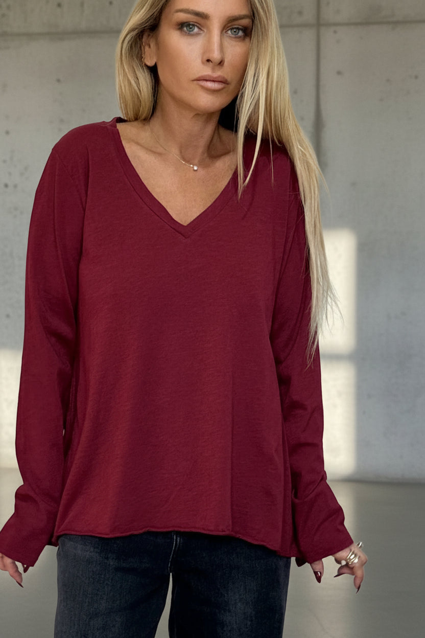 טי-שירט בייסיק חלקה בגזרת V נינוחה עם שרוול ארוך. עשויה מבד כותנה קליל ורך למגע, מושלמת לשילוב יומיומי. מתאימה ללבישה בפני עצמה או כשכבת בסיס מתחת לז’קטים וסוודרים. זמינה במגוון צבעים עשירים ליצירת לוק מותאם אישית בכל עונה
