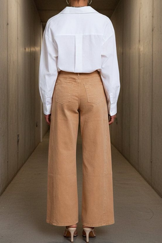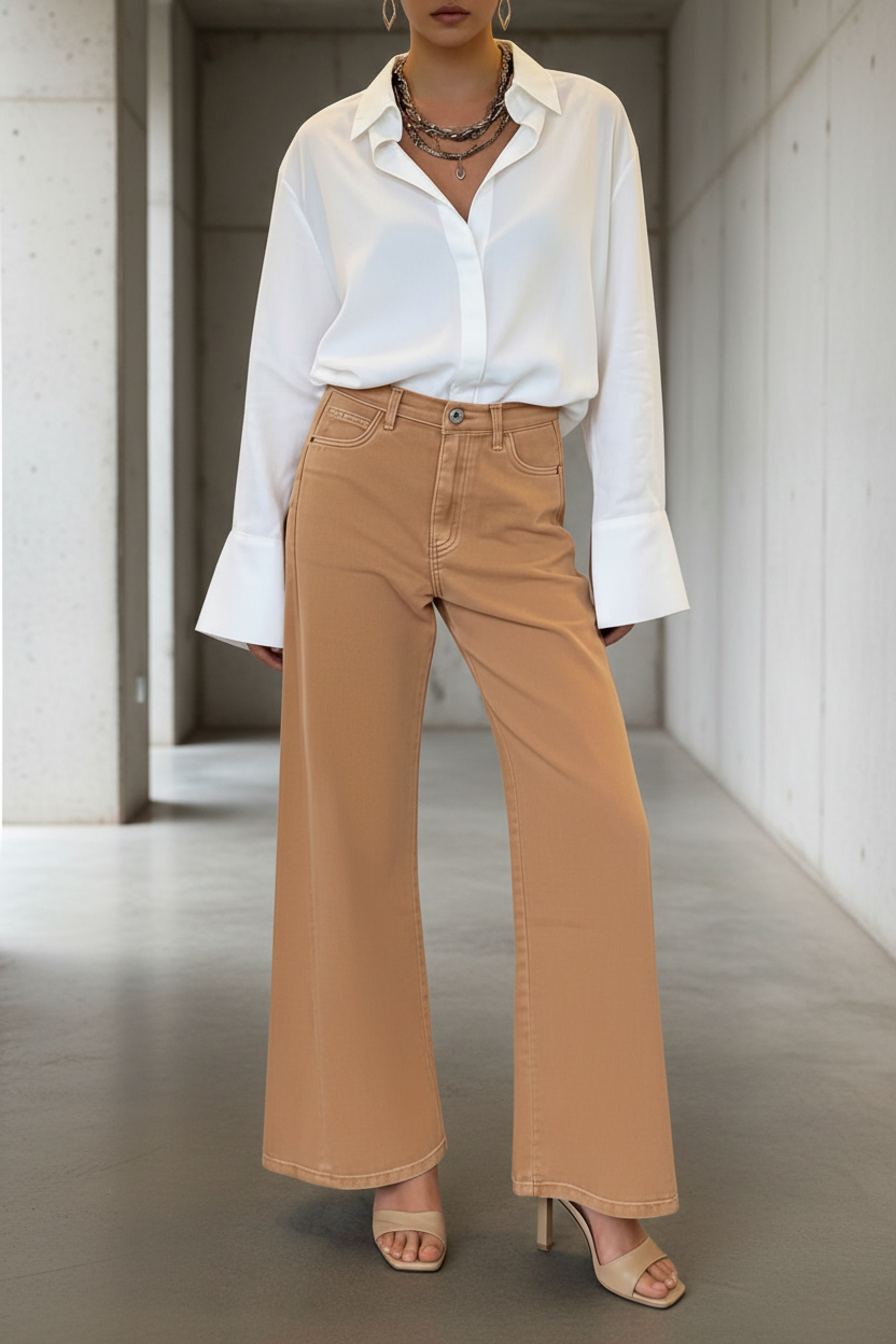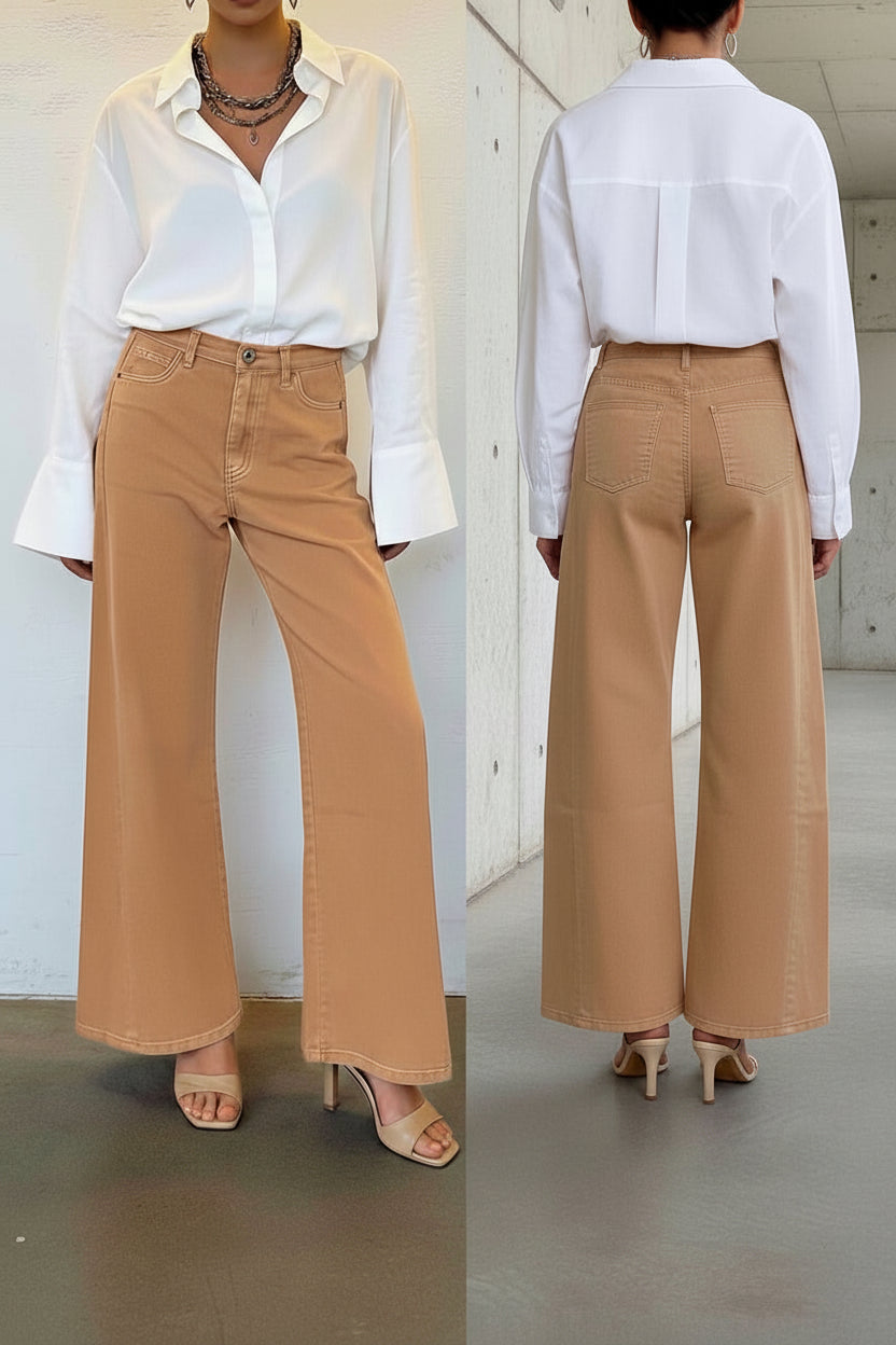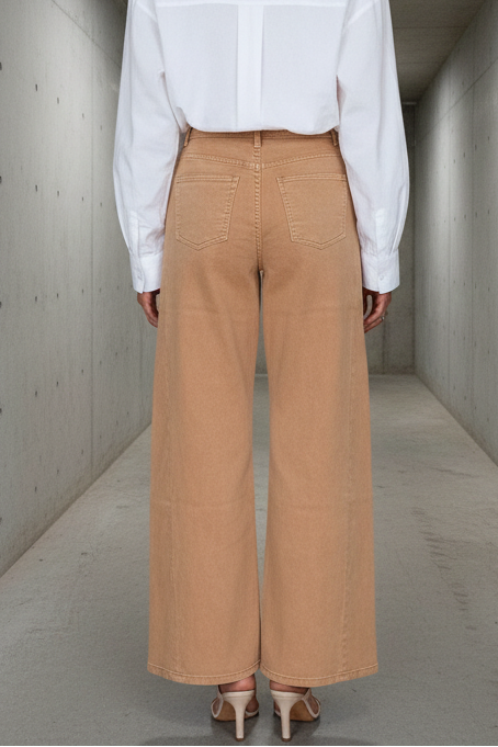 עשוי דנים רך ונעים בצבע קאמל טבעי, שיושב מדויק במותן ויורד בצורה ישרה ורחבה לאורך הרגל.