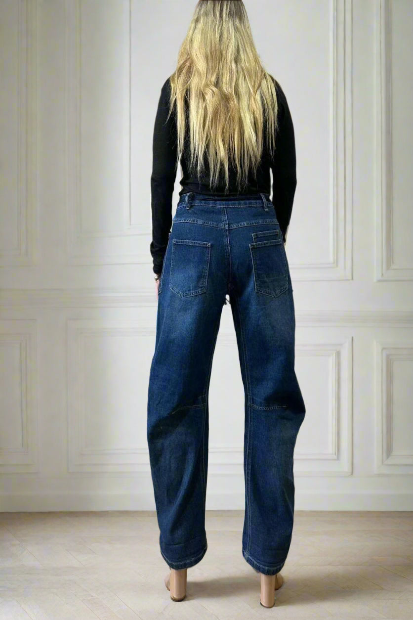 עשוי דנים כחול בגוון שטוף, עם כיסי צד גדולים ותפרים דקורטיביים שמעניקים טאץ’ אורבני