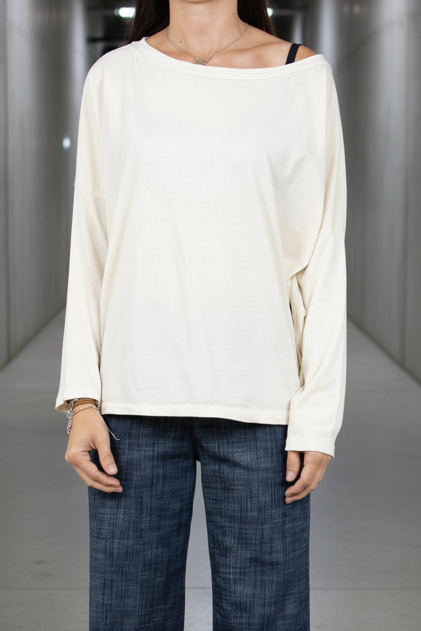 חולצת כותנה רכה ונעימה בגזרת אוברסייז קלילה, עם מחשוף רחב וצוואר עגול מעט שניתן להוריד על הכתף לסטייל נשי ולא מתאמץ.