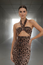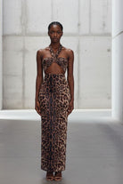 שמלת ערב מקסי בהדפס מנומר עם חיתוך קדמי נועז