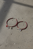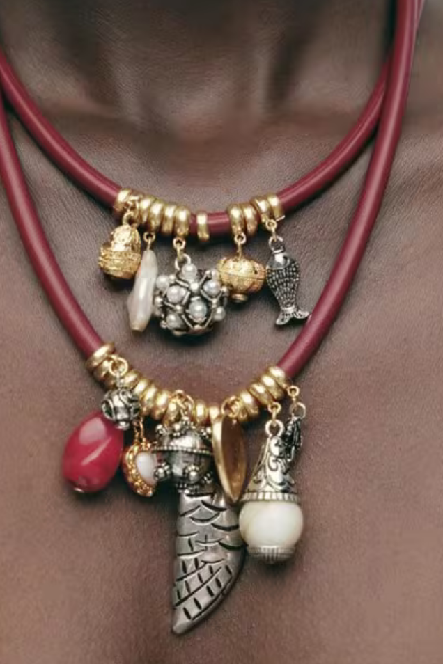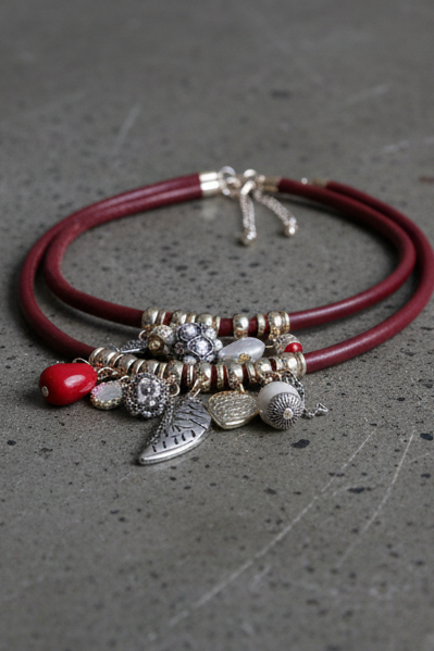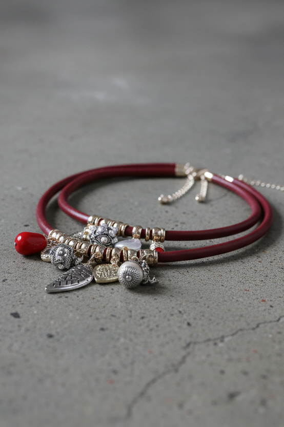 שרשרת צ’וקר בגוון בורדו עמוק עם תליוני צ’ארמס בשילוב זהב וכסף, בהשראת עולם וינטג’־רוק עם טאץ’ אקלקטי נועז.