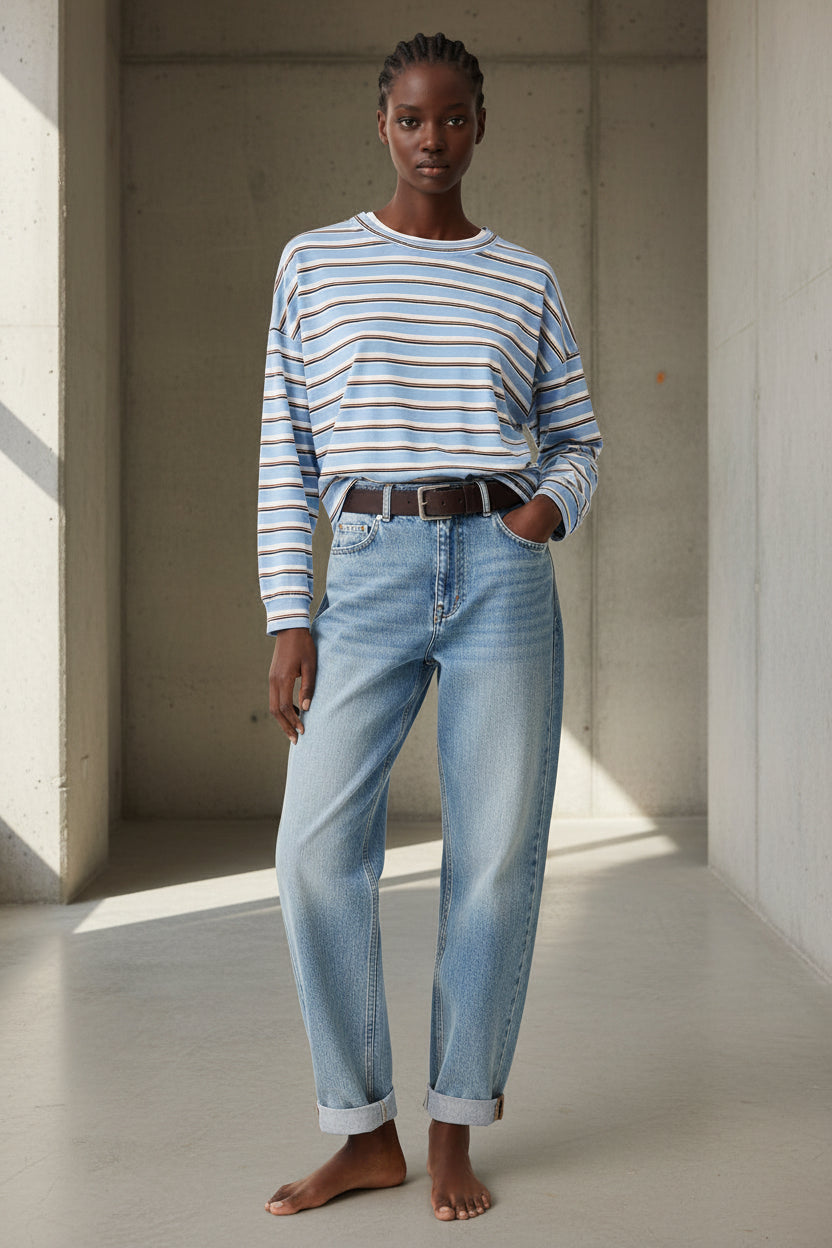 חולצת פסים קלילה בגזרת אוברסייז עם שרוולים ארוכים וצווארון עגול
