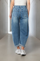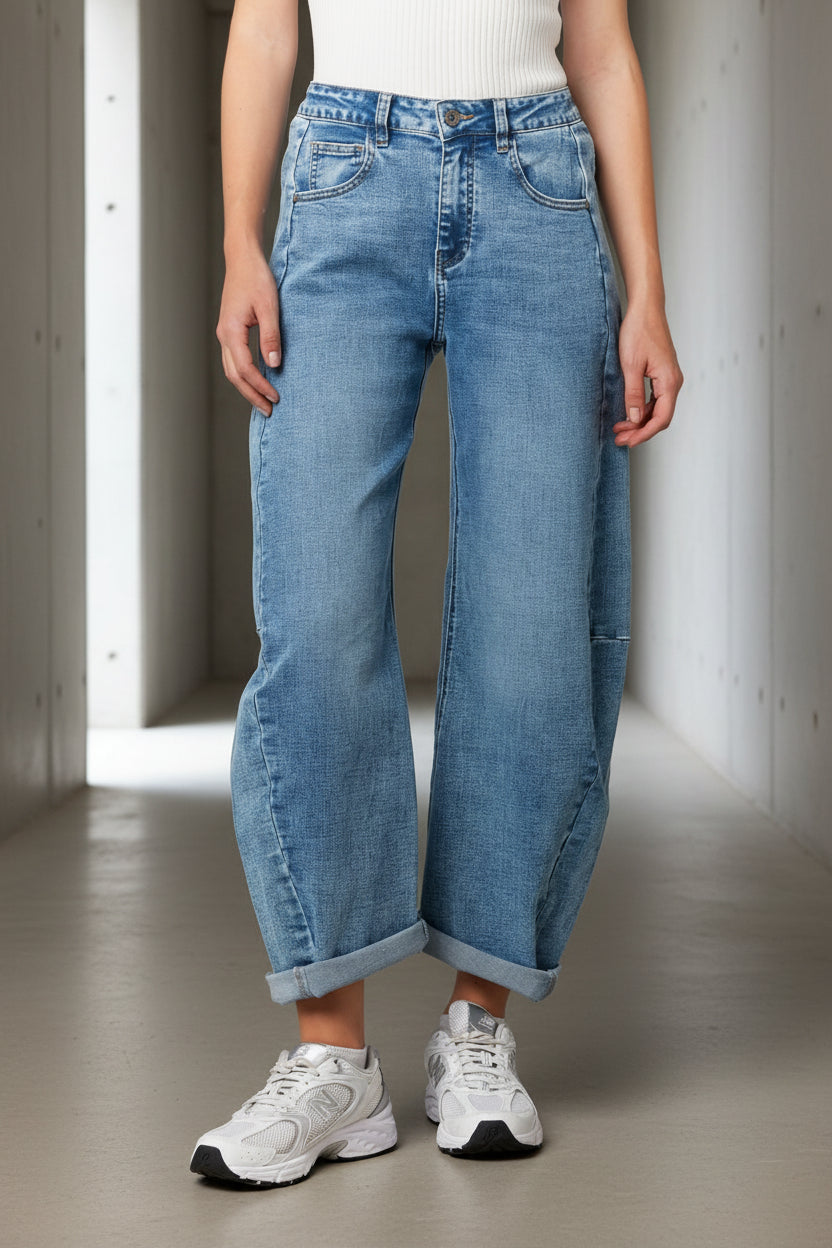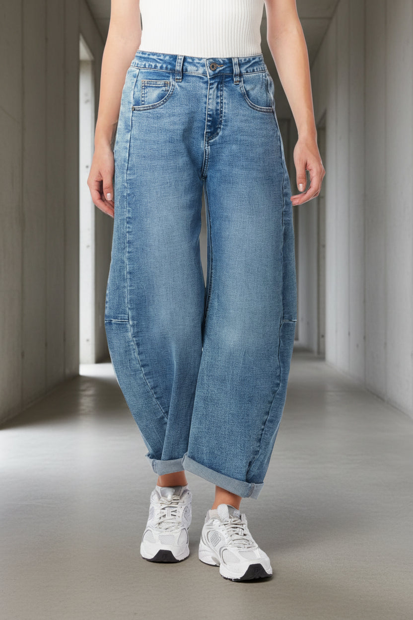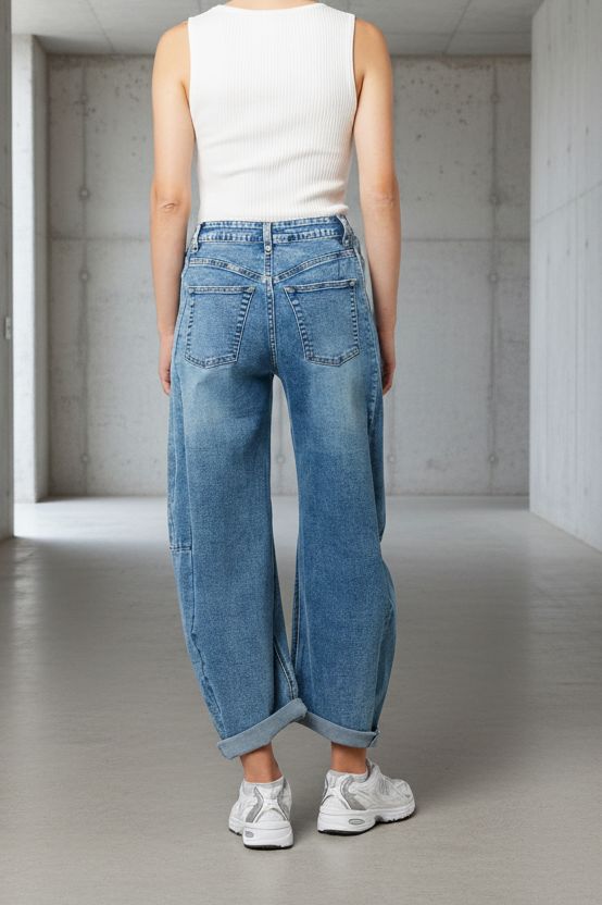 ג’ינס בגזרת Balloon Wide-Leg עם סילואט עגול ומחמיא, בד דנים רך וווש כחול עדכני.