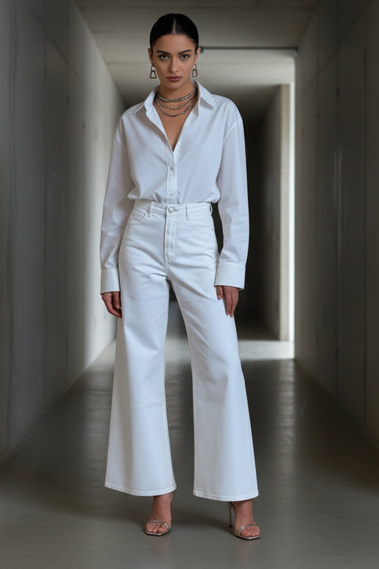 עשוי דנים רך ונעים בצבע לבן, שיושב מדויק במותן ויורד בצורה ישרה ורחבה לאורך הרגל.