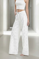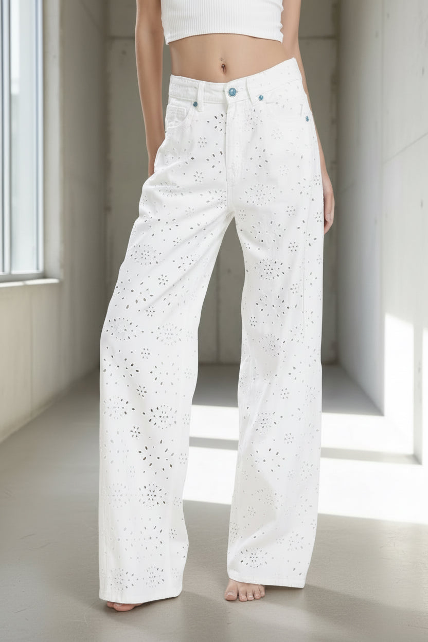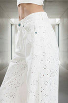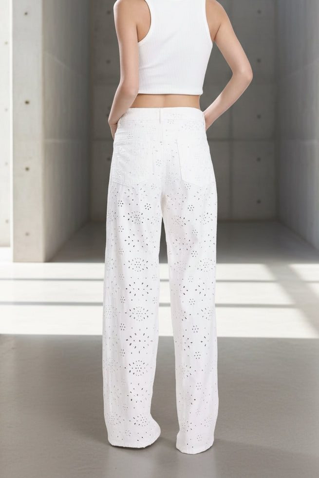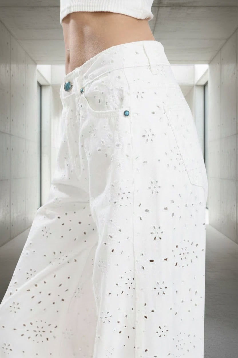 מכנסיים לבנים בגזרה רחבה ואלגנטית עם עבודת רקמה מחוררת (Broderie) עדינה שמעניקה מראה קיצי, נשי וייחודי.