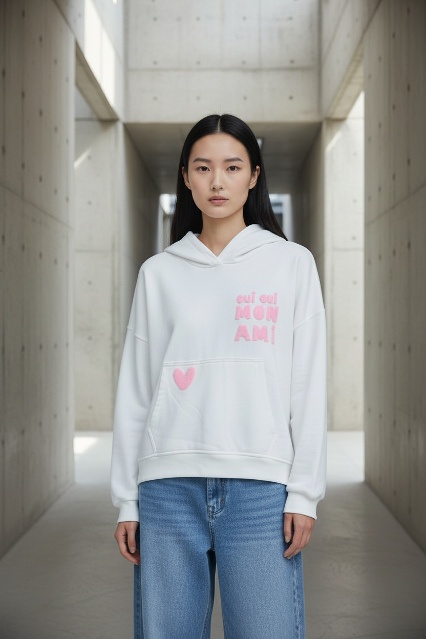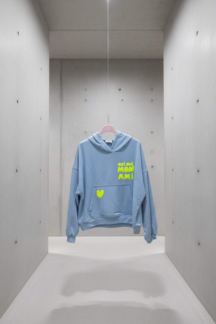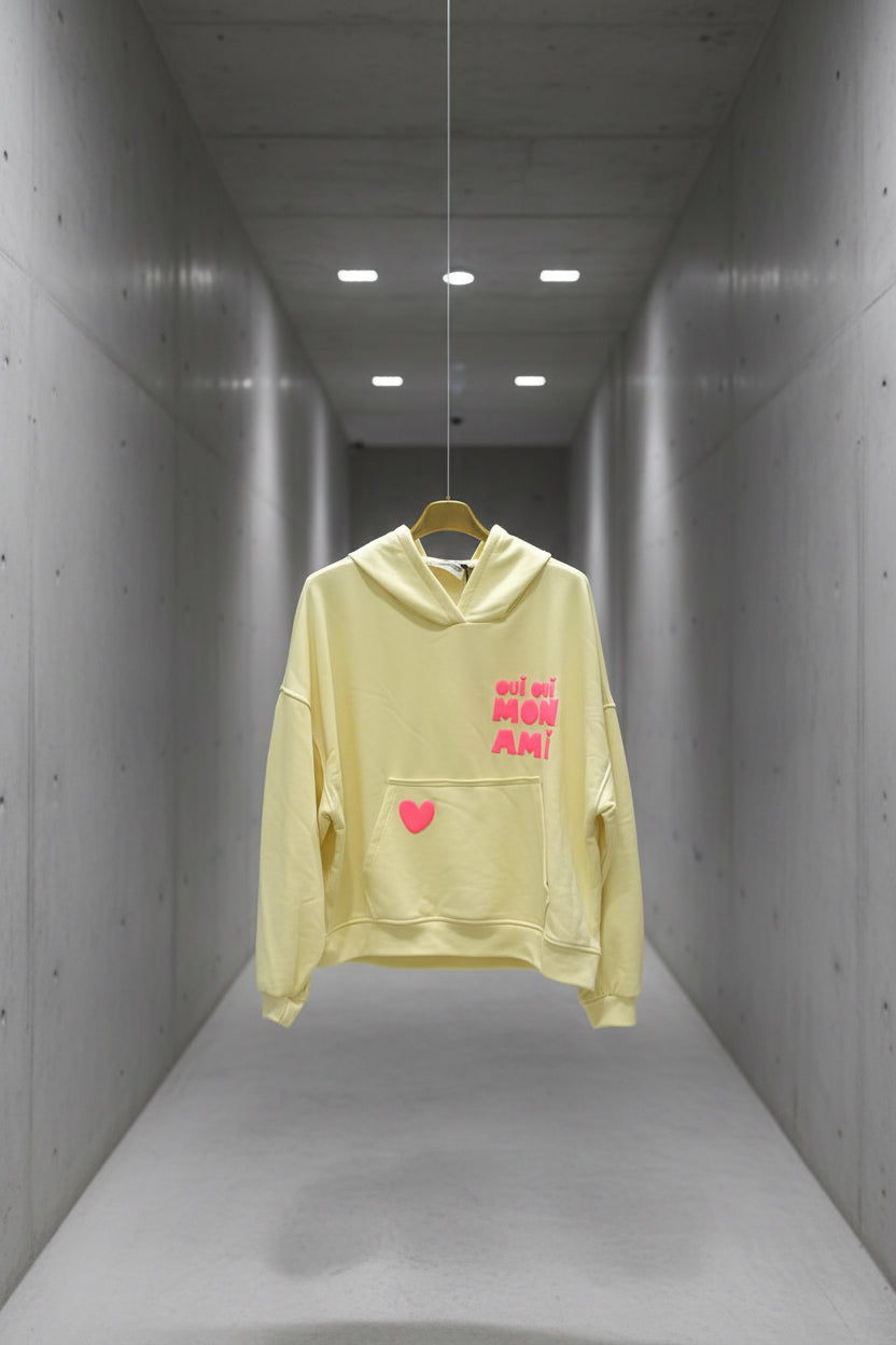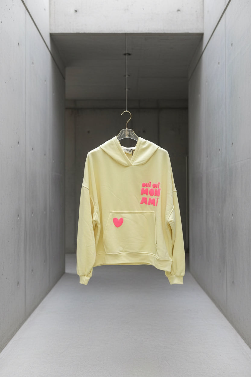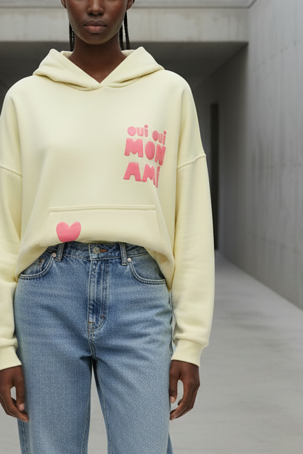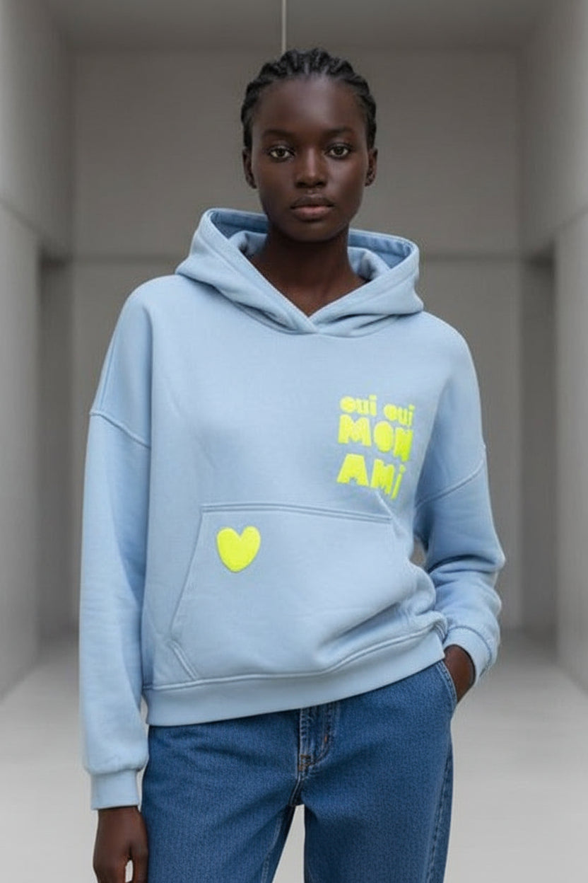 הדפס קדמי בצבעי ניאון (לב וביטוי “oui oui mon ami”) מוסיף טאץ’ אופנתי ושמח.