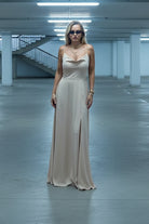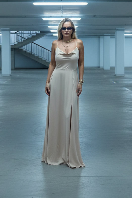 שמלת מקסי נשית ומחמיאה בגוון בז. עשויה מבד רך ונשפך שמעניק תנועה אלגנטית וקלה. החלק האחורי מעוצב בגזרת גב חשוף עם Smok אלסטי, שמעניק התאמה מושלמת ונוחות מירבית. כתפיות דקות נקשרות ליצירת מראה רומנטי ועדין, ומפתח החזה הנינוח משלים את המראה הקלאסי-חגיגי. אידיאלית לאירועים מיוחדים, חופשות קיץ וערבים אלגנטיים