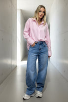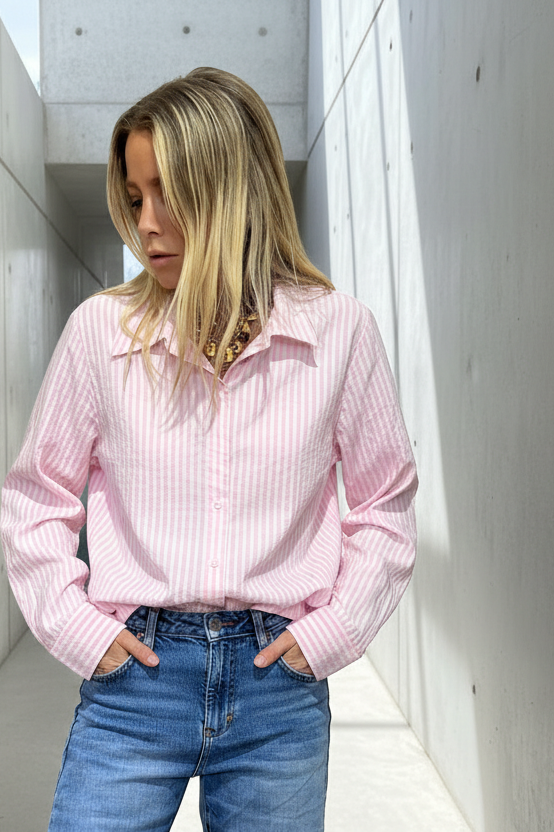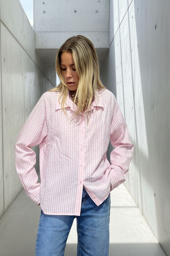 חולצת כפתורים קלילה בגזרת אוברסייז עם טקסטורה עדינה ומראה פסטלי רך.