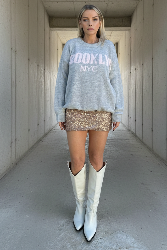 חצאית פאייטים קצרה ונוצצת בגזרת מיני מחמיאה, עם הברקה עדינה שמייצרת לוק אלגנטי ונועז.