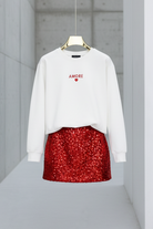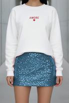 חצאית פאייטים קצרה ונוצצת בגזרת מיני מחמיאה, עם הברקה עדינה שמייצרת לוק אלגנטי ונועז.
