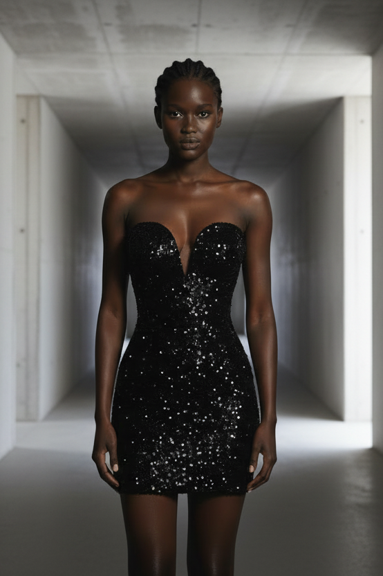 שמלת ערב קצרה וסופר־זוהרת בגזרת סטרפלס מחמיאה במיוחד.