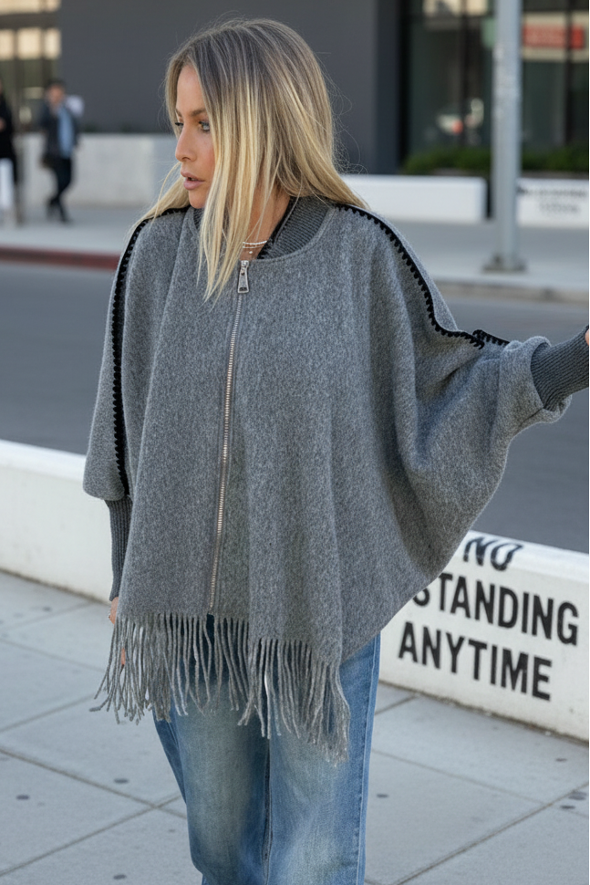 ג׳קט־פונצ׳ו רך ומפנק בגזרה אוברסייז, עם סגירת רוכסן קדמית ושוליים מעוטרים בפרנזים לסטייטמנט שיקי ולא מתאמץ.