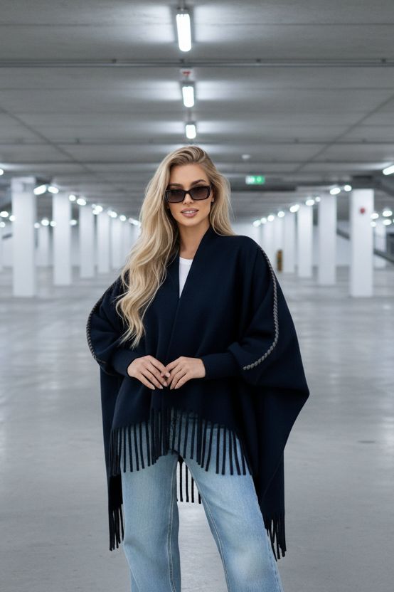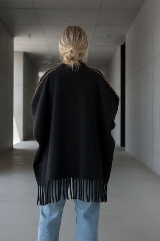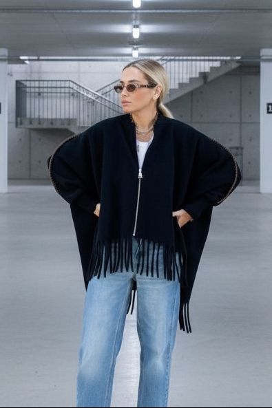 ג׳קט־פונצ׳ו רך ומפנק בגזרה אוברסייז, עם סגירת רוכסן קדמית ושוליים מעוטרים בפרנזים לסטייטמנט שיקי ולא מתאמץ.