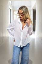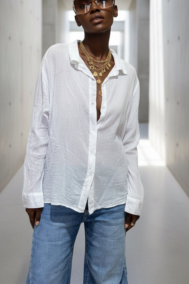 חולצה מכופתרת עשויה בד דקיק ורך מ־100% כותנה.